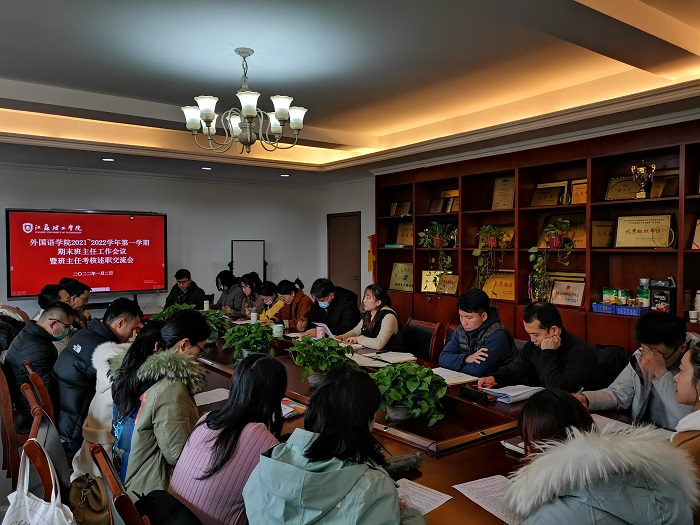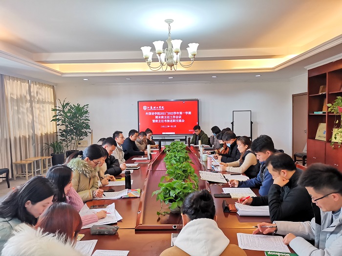 1月2日中午,外国语学院在外语楼210会议室召开2021-2022学年第一学期期末班主任工作会议暨班主任考核述职交流会,全面总结和考核学期班主任工作完成情况。院党委书记贾仕林、院党委副书记兼副院长王志贤、全体辅导员、班主任参加了会议,会议由院学工办主任占成主持。