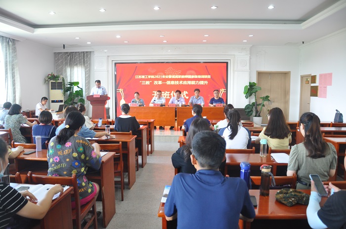 8月1日上午,江苏理工学院2021年安徽省高职教师国家级培训项目“三教”改革—信息技术应用能力提升培训班在外语楼503报告厅举行开班仪式。继续教育学院院长、全国重点建设职教师资培训基地办公室主任陈胜权,江苏理工学院党委委员、原外国语学院党委书记、现管理学院党委书记贾仕林,外国语学院院长张鑫,原院长王维倩,副院长王毅,副院长李世存,授课教师代表,培训班相关负责人,23名培训学员等参加了现场会议,另外因受疫情影响尚未到校的7名学员同步线上参加了会议。开班仪式由李世存主持。