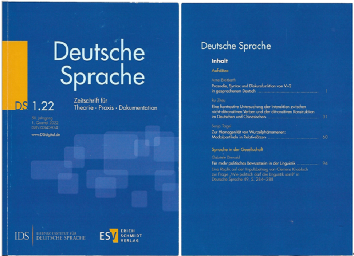 《Deutsche Sprache(德语)》为德国主要的德语语言学季刊,由莱布尼茨德语研究院(IDS,Leibniz-Institut für Deutsche Sprache)主办、埃里希·施密特出版社(Erich Schmidt Verlag)出版,并收录于艺术与人文学科引文索引(A&HCI,Arts & Humanities Citation Index)。该期刊所刊发论文涵盖德语语言学各大分支,主要涉及语法和词库研究、认知语言学、社会语言学、篇章/话语语言学、互动语言学乃至应用语言学。