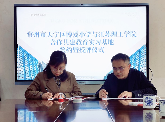 高洁简要介绍了博爱小学近年来的整体发展,尤其是英语学科的发展及博爱小学与江苏理工学院良好的合作,对与外国语学院英语(师范)专业开展教育实习表示欢迎与期待。王毅简要回顾了英语(师范)专业发展的历程,以及人才培养方案中教育见习与教育实习的安排,并衷心感谢博爱小学对英语(师范)专业人才培养的大力支持。王毅与柴曙瑛分别代表合作双方签约实习基地共建协议。王毅为博爱小学授牌江苏理工学院实习基地。