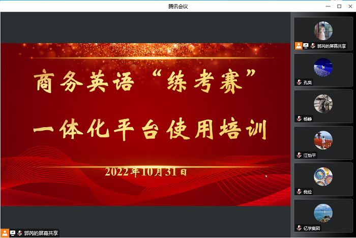 10月31日晚,商务英语系通过腾讯会议开展练考赛一体化平台使用培训,厦门亿学软件有限公司负责人、校督导专家王维倩、外国语学院副院长王毅、副院长李世存、商务英语系主任郭芮、副主任陆赟及系部全体教师参加了会议。会议由郭芮主持。