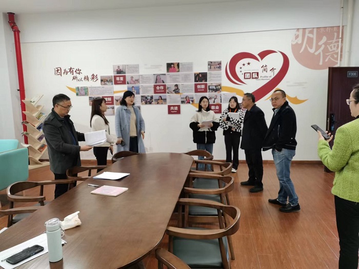 明德实验中学见面会上,刘建昌副校长代表在外出差的戴界蕾校长对外国语学院来访表示欢迎。他简要介绍明德实验中学发展情况,详细讲解学校对于英语师范见习生指导师资配备,对于见习生的表现表示满意和赞赏,希望未来能够更好加强明德实验学校与江苏理工学院外国语学院的联系和合作。徐锦珠主任对外国语学院两年来在教育见习、论文合作指导等方面与明德深入开展的校校合作成果表示肯定,强调明德教师团队会更好地投入到合作中,持续培养见习生的关注能力和引领能力。英语教研组组长陆翠翠老师从师德体验、教学体验、教学实践,以及论文指导等方面详细介绍明德实验中学英语教研组为见习生制订的见习规划,见习导师代表许雅兰老师深情回顾过往一年的指导经历,表示将继续用心为见习生们的成长提供帮助。英语(师范)专业见习生季嘉洁代表见习生感谢明德实验学校对于见习生的关心和指导,表示未来在教育教学中要继续努力向老师们学习。王毅副院长代表外国语学院感谢明德实验学校长期以来对英语(师范)专业教育见习的大力支持,全力关怀和规范要求,要求英语(师范)生认真向明德的榜样学习,在教学备课、观课、授课,以及班级管理等方面加快成长。张鑫院长指出明德实验中学详尽的指导方案、精细的见习安排为师范生迅速成长提供了保障,期望未来院校有更多深层次的合作,希望见习生们抓住好时机,虚心学习,不断提升自身的教育教学综合素养。