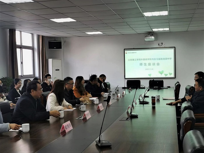 清潭中学见面会上,蔡军书记简要回顾清潭中学与江苏理工学院的合作渊源,表示清潭中学作为公办学校担负着职前师资培养的责任,愿意为英语(师范)专业职前师资培养提供便利条件,希望见习生进校后能够积极参与听课、评课等各项教研活动,融入到学校的学科教学活动中,不断提升自身教育教学能力与素养。同时,蔡书记期待未来能够和外国语学院深入合作探索试行师范专业顶岗实习,在解决中学师资结构性不足问题的同时,提高师范生的教育教学能力。张鑫院长简要介绍了英语(师范)专业近年来的发展,并对清潭中学长期以来关心、支持外国语学院英语(师范)专业建设表示衷心感谢。学生座谈中,张鑫院长和王毅副院长表示希望见习生们能够充分利用教育见习的机会,有效将高校课堂理论教学与中学一线教学实践相融合;王志贤副书记强调见习生要抓住见习与实习机会,主动观察、积极动手、用心做事。