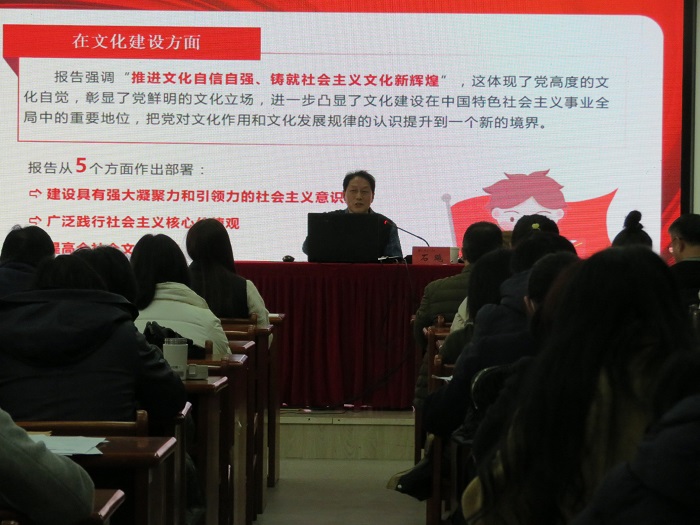 石飚从八个方面解读了党的二十大报告的核心内容,强调要加强党对高校的全面领导,更加自觉地用党的二十大精神统一思想、统一意志、统一行动,切实把党的二十大精神贯彻落实到办学治校全过程各方面,努力推进学校高质量发展。青年教师教育工作者要立志做有理想、敢担当、能吃苦、肯奋斗的新时代人类灵魂工程师,为学院和学校事业的高质量发展添砖加瓦。