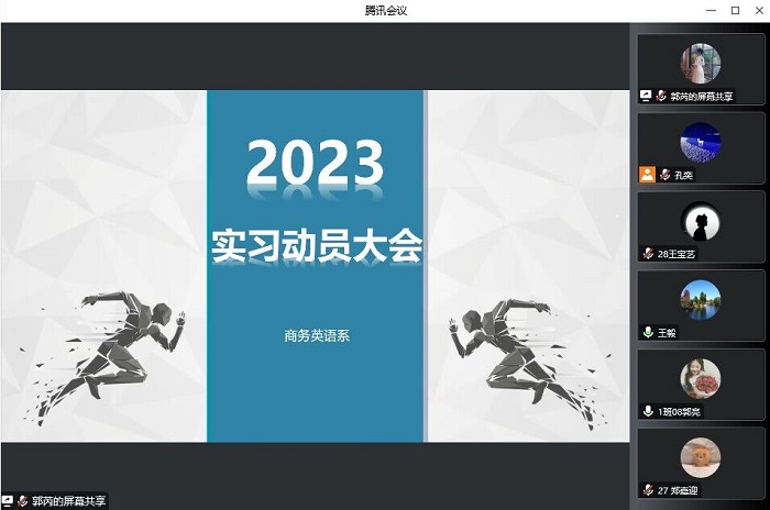 12月26日晚,商务英语系通过腾讯会议召开2023届在线实习动员大会。副院长王毅、系主任郭芮、商务英语系教师孔奕及2019级全体学生参加了会议。会议由郭芮主持。