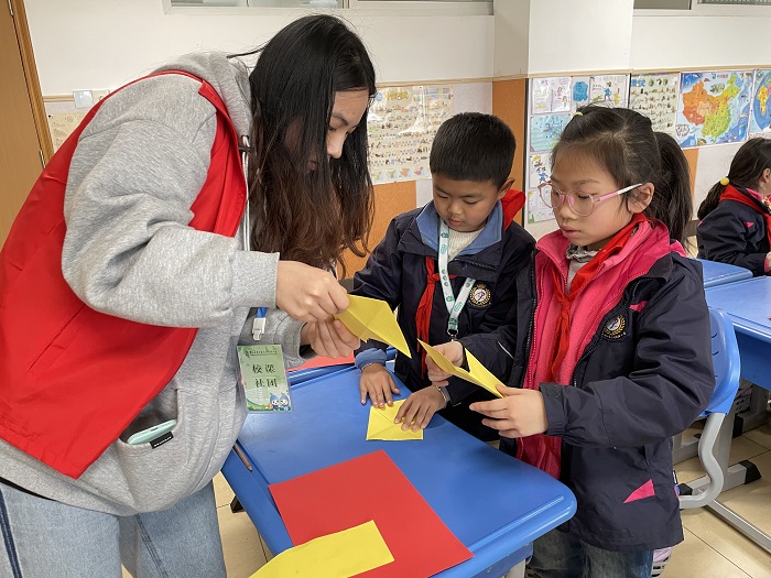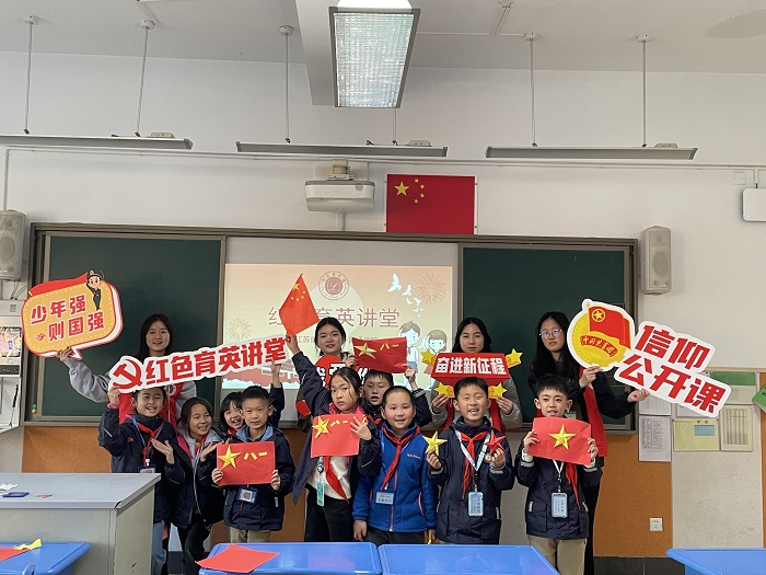 3月13日下午,来自江苏理工学院外国语学院红色育英讲堂宣讲团的大学生志愿者来到常州市新北区三井实验小学,上了一堂别开生面的红色地方文化思政课。宣讲团志愿者围绕“你知道的英雄名字”知识问答进行导入,向小学生介绍了常州三杰张太雷、瞿秋白、恽代英的英雄事迹,并以常州三杰在南昌起义时的英勇表现为依托,带领他们手工制作中国人民解放军军旗,引导小学生从小树立远大理想,用实际行动报效祖国。