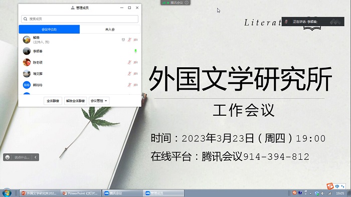 3月23日晚,外国语学院外国文学研究所召开期初工作会议。研究所全体成员通过腾讯会议平台参会,讨论年度工作计划。