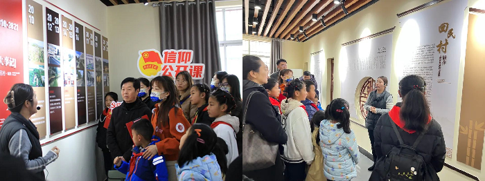 红色育英流动巴士的第二站来到了美丽乡村——常州市武进区雪堰镇回民村。在解说员的讲解下,大家参观了村史馆,深入了解了回民村的历史文化和美丽乡村蝶变历程,深切地感受到了在乡村振兴的时代洪流下,一幅“产业兴旺、生态宜居、乡风文明、治理有效、生活富裕”的画卷在回民村缓缓铺开。随后大家来到集党建阵地、科普展示、阳湖书房于一体的美学馆,共同学习党建文化,了解与农村相关的国家政策。在这里,江苏理工学院外国语学院党委副书记、副院长王志贤为大家上了一堂题为《学习“两会”精神 勇担青春使命》的信仰公开课。