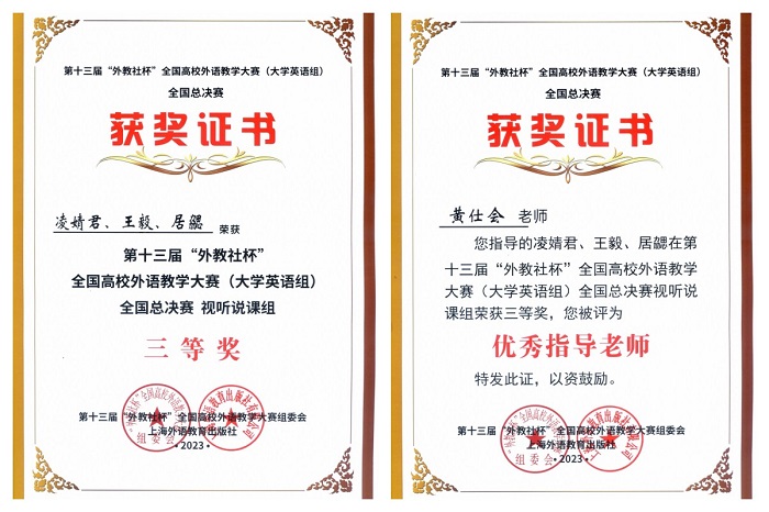 近日,第13届“外教社杯”全国高校外语教学大赛全国决赛、总决赛在上海外国语大学闭幕。本次赛事汇聚60位全国省赛选拔出的特等奖选手,经过激烈的角逐,外国语学院教师凌婧君、王毅、居勰竞赛团队代表江苏省参加全国总决赛,荣获大学英语(视听说组)全国三等奖,黄仕会老师荣获优秀指导老师奖。