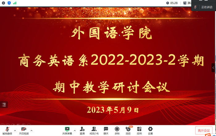 5月9日晚,商务英语系通过腾讯会议召开期中教学研讨会在线会议,校督导专家鲁吉、商务英语系主任郭芮、副主任陆贇及系部全体教师参加了会议。会议由郭芮主持。