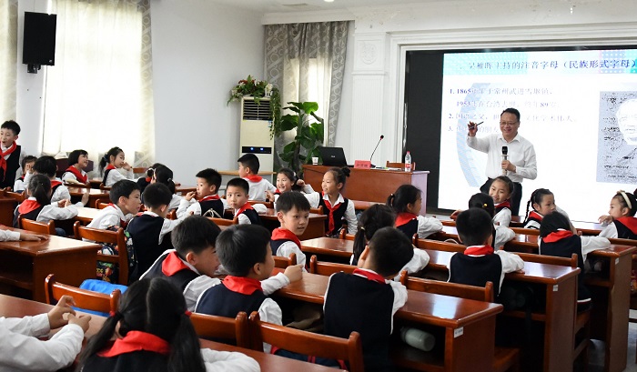 英语商务英语系教工党支部志愿者们陪同少先队员们参观优美校园风景,讲解外语人“学地道外国语,做真正中国人”的院训精神内涵,分享外国语学院三十余年来踔厉奋发的创业史和发展史。常州市语言学会副会长、常州市名人研究院副院长赵贤德教授应杨国萍书记的邀请专程为少先队员们做《常州人与汉语拼音》专题讲座,深化少年儿童家国认知,激发强烈的爱国热情与民族自信。