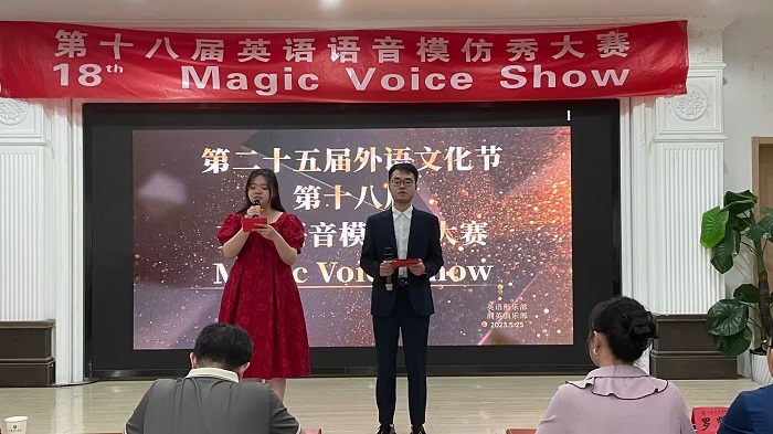 5月25日晚,外国语学院英语俱乐部和商英俱乐部主办的第二十五届外语文化节之第十八届英语语音模仿秀大赛于外语楼503报告厅成功举行。外国语学院副院长王毅、常州纺织服装职业技术学院徐勇飞、刘友全、英语系教师符君作为大赛嘉宾出席。大学外语部主任黄仕会、商务英语系主任郭芮、商务英语系教师杨峥、英语系主任杨国萍、英语系教师罗贤卿担任本次大赛评委。英语师范专业和商务英语专业22级学生一同观赛。比赛由20英语4S李欣慧和21英语2S薛杨昌主持。