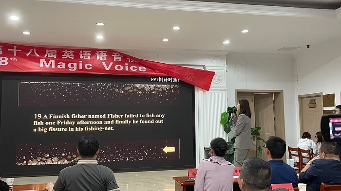 比赛中,22级英语系、商务英语系以及常州纺织服装职业技术学院的15位选手准备充分、发挥稳定、热情高涨,选材各有特色,题材广泛,涵盖演讲、经典电影片段和纪录片片段等,丰富比赛内容,提高比赛观赏性,拓宽观众眼界。多样化选材和精彩语音模仿引起同学们的赞叹,充分彰显英语语音的魅力。比赛板块中的英语绕口令充分展示了选手的临场发挥能力、语音功底及口语发音技巧。比赛间隙,21英语2S王海宁、21英语1S郁鋆煊、21商英2邵蓉蓉的配音表演更是充分展现了高水平语音能力,赢得满堂喝彩。
