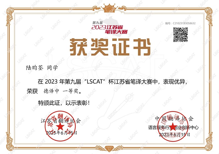 近日,由中国翻译协会、江苏省翻译协会、江苏省高等学校外语教学研究会联合举办的第九届“LSCAT杯”江苏省笔译大赛奖项揭晓。德语系学子再创佳绩,共有53人次在“德译汉”和“汉译德”竞赛组别获奖。其中,德语系再次斩获“江苏省笔译之星”1名,一等奖4名,二等奖17名,三等奖28名,优胜奖4名。