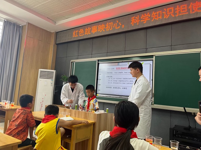 化工学院的两位志愿者带领小朋友们做了“模拟火山爆发”、酚酞变色等三组有趣的实验,每一个神奇的化学实验现象都深深吸引着孩子们,使孩子们对科学知识产生了浓厚的兴趣。接着,外国语学院的志愿者们带着孩子们做了传声筒的物理小实验,由此来感受物理学科的魅力。志愿者们借助传声筒传递信息的功能引出今天所讲述的红色故事《鸡毛信的故事》。互动提问、有趣的视频等环节让小朋友了解到小英雄海娃是如何惊险躲过敌人的搜查,成功将鸡毛信送达,海娃机智、勇敢、从容的品格和精神深深感染现场小朋友。《鸡毛信》的故事,让小朋友们领悟到了战争年代的艰辛和小英雄海娃的优良品质。从鸡毛信到现代通讯的变化也让小朋友们体会到科技的发展以及科学的神奇之处。