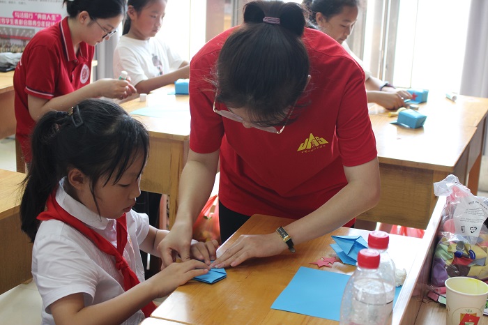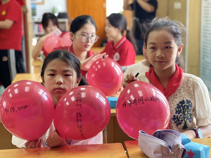 劳动体验结束后,江苏理工学院外国语学院红色育英宣讲团的成员们,为小朋友们带来了一场别开生面的井冈山精神宣讲。他们以红色列车的新颖形式带领小学生情境重现,列车途径文家市、黄洋界、红军烈士墓等三地,用一段穿越时空的对白带领小学生们深刻领会井冈山时期红军战士艰苦奋斗的优良品质,和井冈山精神的时代内涵。在宣讲团成员的指导下,小朋友们亲手制作红军军帽,并在气球上写下对井冈山革命精神的传承决心和对祖国未来的美好憧憬。同学们纷纷表示,田间劳作的辛苦与井冈山时期红军战士的艰苦相比不值一提,作为新时代的青少年要继承和发扬井冈山精神,为祖国的发展贡献自己的力量。