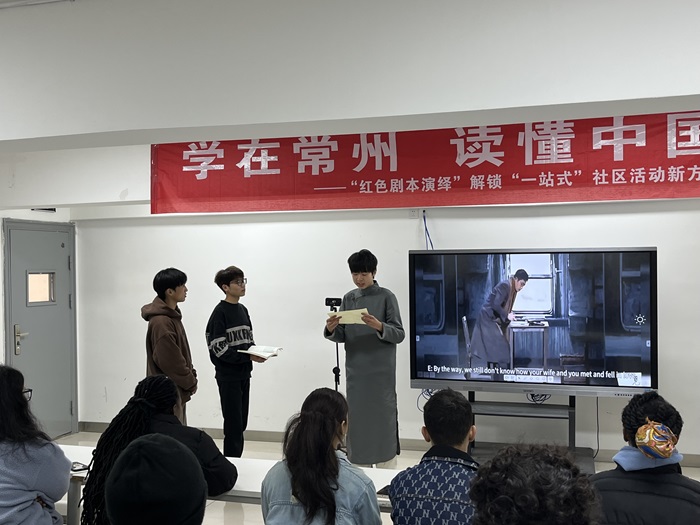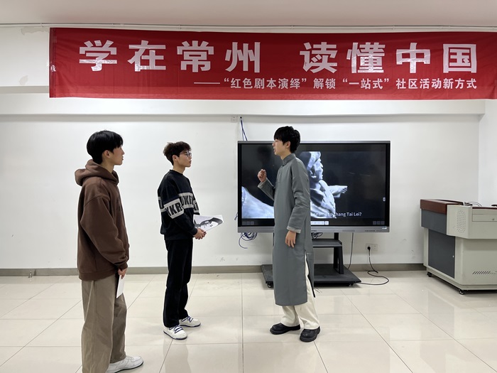 “Changzhou Three Revolutionaries, as the early leaders of the Chinese Revolution...” ,在江苏理工学院博学“一站式”学生社区,外国语学院红色育英宣讲团的成员们正在为国际教育学院留学生演绎一场红色双语情景剧《常州三杰——张太雷篇》。
