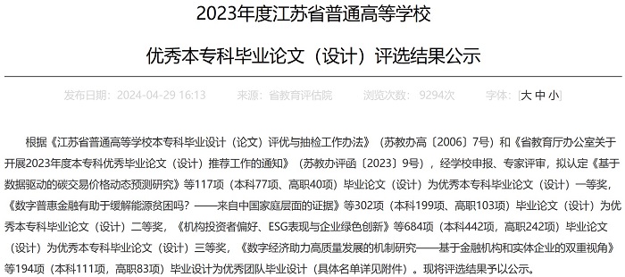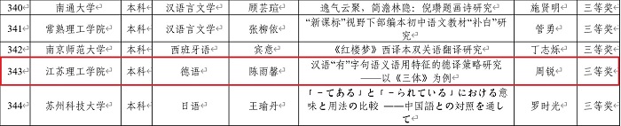 由德语系教师周锐指导、19级学生陈雨馨撰写的本科毕业论文《汉语“有”字句语义语用特征的德译策略研究——以〈三体〉为例》(Untersuchung der Strategien zur Übersetzung semantischer und pragmatischer Merkmale der chinesischen yǒu-Sätze ins Deutsche - am Beispiel von „Die Drei Sonnen“)在2023年度江苏省普通高等学校优秀本专科毕业论文(设计)评选中荣获优秀本专科毕业论文(设计)三等奖。这是我系学生首次获得省级优秀毕业论文的荣誉,也是该年度全省德语专业唯一一篇获评优秀的本科毕业论文。