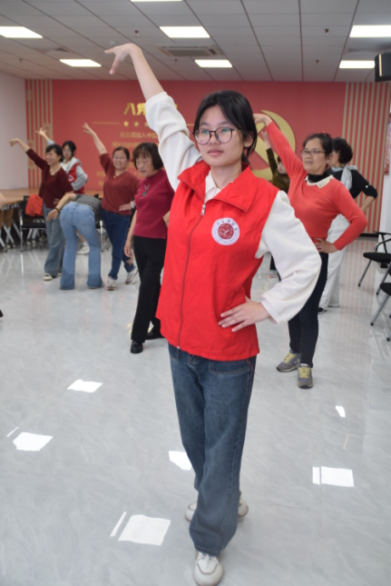 活动正式开始,吴老师边讲解动作边示范,从手势、站姿、脚步等方面详细展开解释、耐心进行指导,仔细纠正不到位的的动作,确保大家都能跟上节奏。