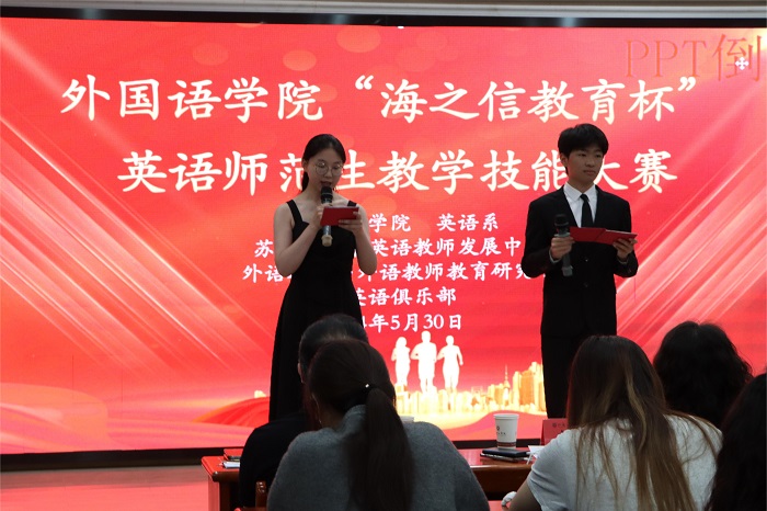 5月30日晚,由外国语学院主办、英语系承办的第六届“海之信教育杯”英语师范生教学技能大赛决赛在外语楼503报告厅成功举行。外国语学院院长张鑫、副院长杨国萍、常州外国语附属双语学校校长李亚男、英语系主任罗贤卿、商务英语系主任郭芮出席并担任比赛评委。教师教育课程组组长束少军、英语系副主任陆海空及21级英语(师范)专业全体学生现场观赛。比赛由英语(师范)专业学生章子贤、张凯凯主持。