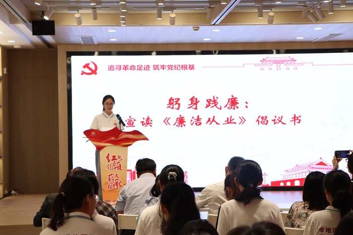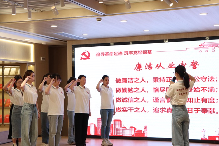 毕业生党员王梓亦宣读廉洁从业倡议书。毕业生代表右手握拳,郑重宣誓,表示将严格遵守廉洁从业的各项规定,自觉接受党组织和群众的监督,做廉洁之人、勤勉之人、诚信之人、实干之人,常存修身之念,常怀敬畏之心,常守慎独之境,为营造风清气正的社会环境贡献自己的力量。