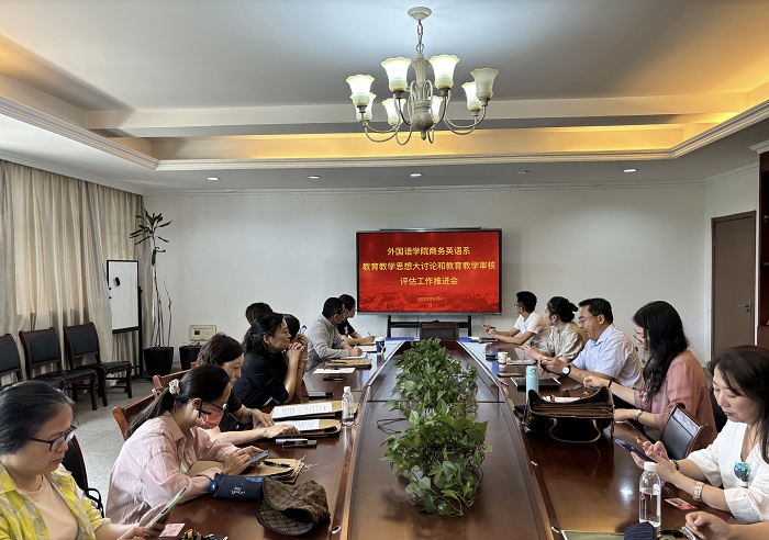 6月4日中午,商务英语系在外语楼210会议室召开教育教学思想大讨论和教育教学审核评估推进会。外国语学院副院长李世存,商务英语系主任郭芮,副主任陆赟及系部全体教师参加会议。会议由郭芮主持。