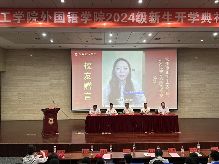 2021届英语师范专业校友、常州市正衡中学英语教师赵婕通过视频方式,分享了自己与外国语学院的深厚渊源,回顾了自己初入大学时的迷茫与探索,她鼓励新生保持锐气与劲头,从小事做起,积小胜为大胜,努力成为具有国际视野和中国情怀的优秀人才。