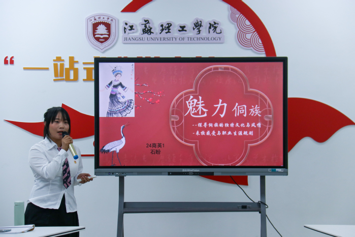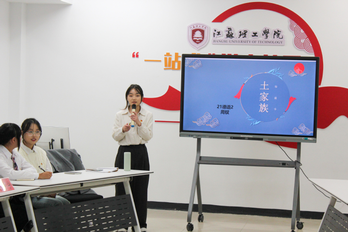 微座谈环节,来自土家族、苗族和侗族的三位学生代表周钗、熊雪瑶和石盼依次分享她们的民族文化、在校感受和职业生涯规划。25届应届毕业生21德语2班周钗同学介绍了土家族的服饰文化和饮食文化,她特别感谢学院在学习和生活等方面给予的关怀与指导,感谢学院专业任课老师为她提供了德语学习上的悉心指导,提及辅导员关注到她的情绪变化,给予鼓励与安慰,让她深刻感受到学院的温暖;24英语3S班的熊雪瑶同学向大家展示了苗族的特色活动,分享了自己的学业规划和职业规划,她表示毕业后希望回家乡任教,将在江苏学到的先进教学方法带给家乡的孩子们,努力成为一名优秀的英语教师;24商英1班的石盼同学来自侗族,她生动形象地分享了侗族的建筑风格和舞蹈艺术,她对于老师们风趣的授课方式和学院对少数民族同学的关心感到特别温暖,也更加坚定了她努力学习,用自己的知识本领回馈社会,为侗族的发展贡献自己的一份力量的决心。