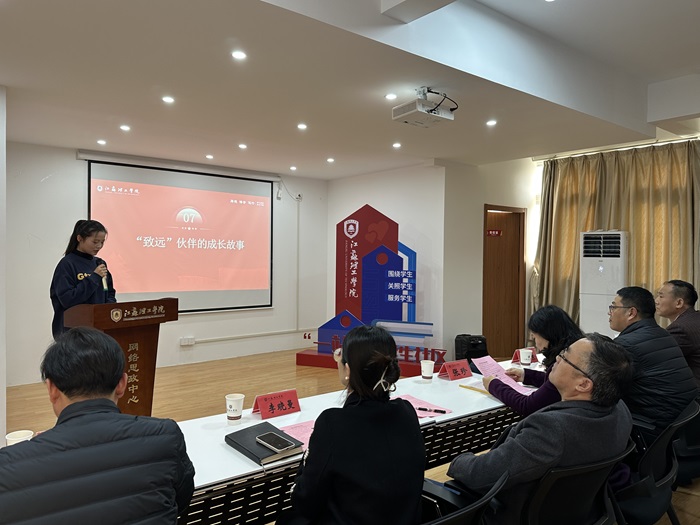 在“致远”伙伴成长故事环节,获得“致远”奖学金的22商英2班汤茹同学分享了与结对校友陆红卫的成长故事,从初次相识的陌生到如今的深厚友谊,学姐的支持与鼓励成为了她不断前进的动力。她的发言充满了真挚的情感,让在场的每一个人都为之动容,感受到了“致远”奖助学金所蕴含的深远意义。陆红卫校友也提前录制了微视频,表达了对学妹成长的欣慰,以及未来继续携手成长共进的期许。