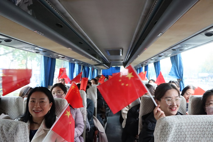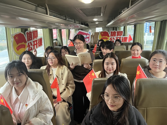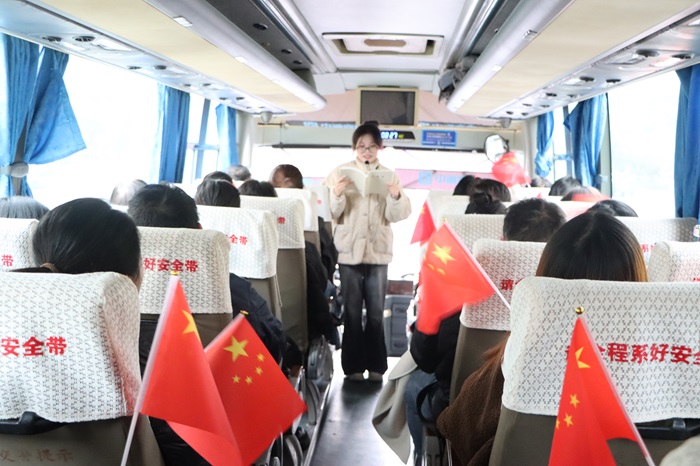 在大巴车上,精心布置的学习环境让人眼前一亮,学生党员挥舞国旗,手举标语。鲜红的国旗下,红色经典“译”站宣讲团成员22商英1宋林和22商英1陆佳媛分别带领师生党员共同学习了《论教育》读本第三篇文章“大力弘扬教育家精神,为党育人、为国育才”。用通俗易懂的语言并结合身边的实例阐释了对教育家精神的理解。