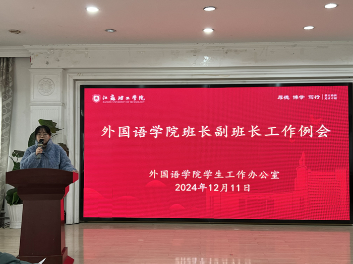 刘宇宁则围绕班长的工作方法与请假、周末去向登记制度等展开讲解,对请假流程中的事前申请、请假报备、周末去向信息报备等关键环节做出确切要求,确保制度执行严谨规范。她还特别讲述了班长、副班长在工作中的沟通技巧的重要性,提醒同学们在工作中注重态度与方法,协助班主任组织开展好“诚信考试”主题班会,落实诚信考试承诺签名等,引导同学们自觉遵守校级校规。她还简要说明了近期相关工作安排,为各班在期末班级管理建设工作明晰了方向,希望各班委要积极发挥模范带头作用,向同学们传递本次会议的精神内涵,引导同学们树立正确的价值观。