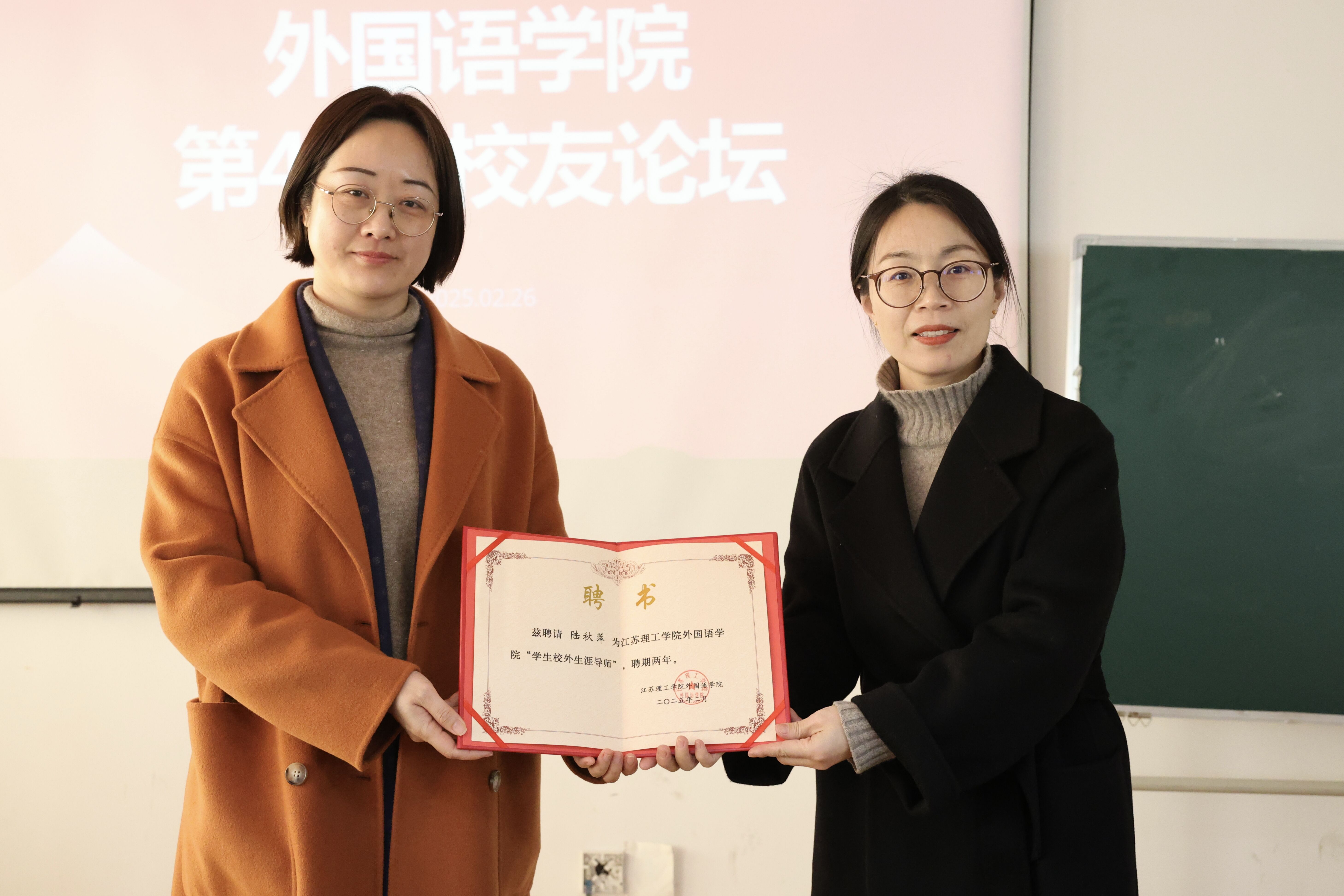 李晓曼为陆秋萍颁发外国语学院“学生校外生涯导师”聘书。