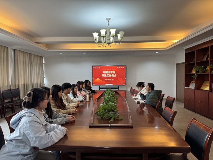 为进一步优化提升2024级导生的工作实绩,深入摸排2024级学生的日常状态,3月12日中午,外国语学院在50#210召开导生工作例会。年级辅导员刘宇宁、陈子薇和全体导生参加会议,会议由刘宇宁主持。