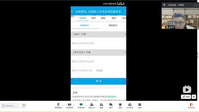 就业指导员卢天赉对需注意的复试细则进行了补充,并希望同学们学会“扬长避短”,在提交的复试材料和自我介绍中不要给自己挖坑,尽可能将面试导师的重点引向自己熟知领域。对于目前还在寻找调剂的同学,他表示,今年由于国家线公布较早,调剂信息相比往年会更早发布,因此要端正心态,根据成绩尽早了解相关院校调剂计划,尤其是在调剂系统开放首周的黄金时段,及时通过官网、电话等渠道确认调剂名额。卢天赉还展示了调剂系统截图,讲解具体填报方式,帮助大家熟悉操作流程,助力同学们在考研征途上增添一份胜算。