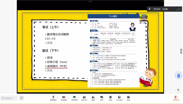 为切实做好2025届毕业生考研复试、调剂服务工作,提高复试成功率,普及调剂系统操作细则,3月8日晚,外国语学院依托腾讯会议线上举办了25考研复试调剂经验分享会。会议由学院就业指导员卢天赉和现就读于南京农业大学英语笔译专业2024校友马芷睿主讲,外国语学院2021级辅导员陈凌峰及部分考研分数达国家线同学参加了会议。