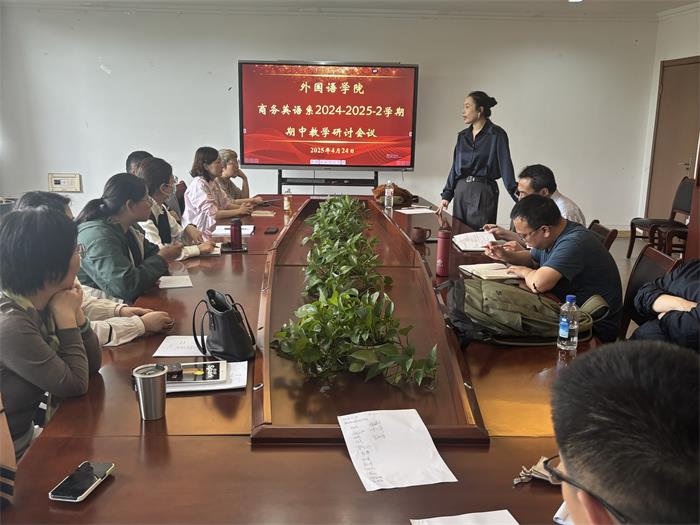 教师座谈会上,郭芮结合期初教学反馈,期中教学检查及贯通式培养方案布置了近期任务。杨峥汇报了“课程思政”融入情况检查结果,对学科竞赛进行阶段性总结。最后,李世存和杨国萍分别对商务英语专业建设工作提出了建议。