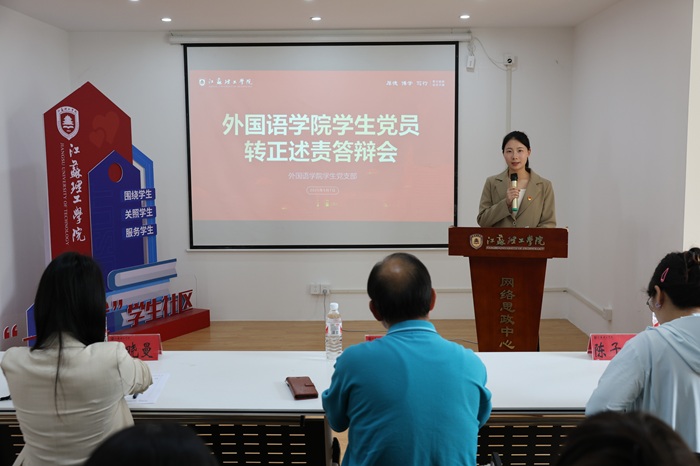 为进一步规范党员发展程序,强化质量把关,同时全面考察党员队伍的政治立场、理论素养、服务成效以及先锋作用发挥情况。5月7日下午2点,外国语学院在38号一站式社区召开学生党员发展承诺答辩会及预备党员转正述责答辩会。此次答辩会特邀江苏理工学院关工委“银发悦龄”志愿服务团团长、“银讲汇”项目负责人张安强,外国语学院党委副书记兼副院长李晓曼,院学生党支部副书记陈子薇等担任评委,全体学生党员参加会议。答辩会由学生党员吴萌怡主持。
