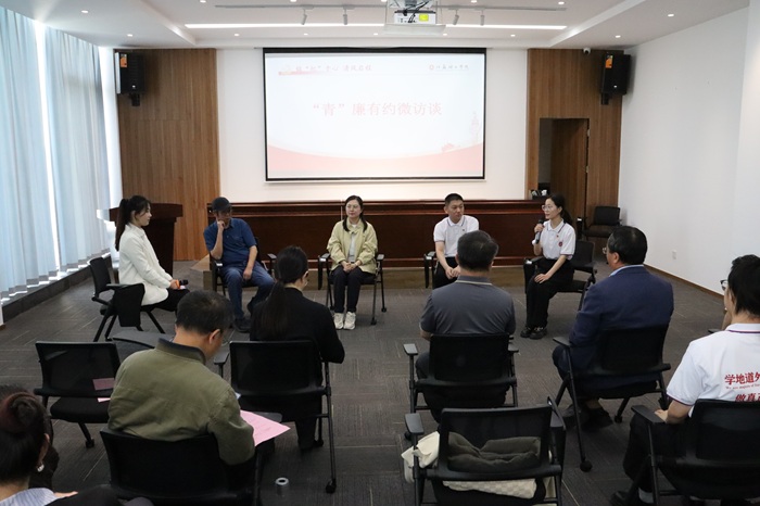 “‘青’廉有约”微访谈环节将活动推向高潮。关工委导师顾丹柯教授以自身翻译习近平总书记引用的“新松恨不高千尺,恶竹应须斩万竿”杜甫的诗句为切入点,强调青年党员要对自己的职业、职务和专业有敬畏之心。大外部沈铭婕老师则围绕自己大学英语公共课教师的身份,讲述如何将“课程思政”融入通识教育全过程,如何设计教学内容,将“诚信自律”“公平正义”等抽象价值观转化为学生可感知的职场伦理认知,从而帮助学生在语言能力提升过程中同步构建适应多元场景的“道德决策力”。毕业生党员祁超分享了他的廉洁承诺:“作为即将奔赴乡村振兴基层工作岗位的毕业生,我将深入学习贯彻习近平总书记给谢依特小学戍边支教西部计划志愿者服务队员的重要回信精神,在基层这个‘物必先腐’风险与‘公生明’机遇并存的考场,以‘常抓不懈、长鸣不息’的姿态,既做‘不恐于诽’的原则坚守者,更当‘先禁其身’的作风示范者,为中国式现代化建设贡献青春力量。”