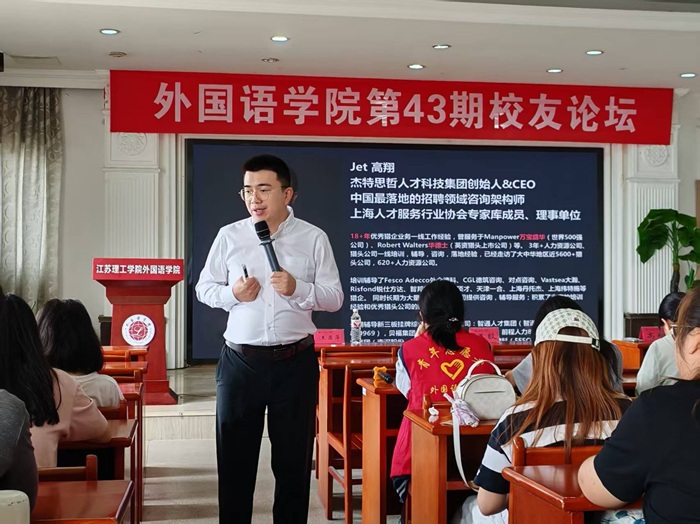 为搭建校友与在校生交流平台,助力学生精准把握职业发展方向,外国语学院于5月17日上午成功举办第43期校友论坛。本次论坛以“从市场需求角度谈大学生职业生涯规划和求职指南”为主题,特邀中国人才研究会理事、杰特思哲人才科技集团创始人兼董事长、外国语学院2007届校友高翔担任主讲嘉宾,外国语学院党委书记王毅,外国语学院校友会秘书长、校离退休工作处副处长王亚萍,辅导员肖景文等出席。