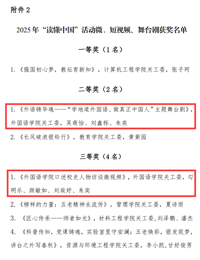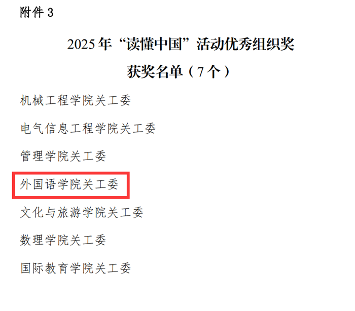 近日,2025年“读懂中国”活动评选结果揭晓,外国语学院关工委凭借优异表现荣获多项荣誉,充分展现了学院在文化传承与创新实践中的深厚底蕴。