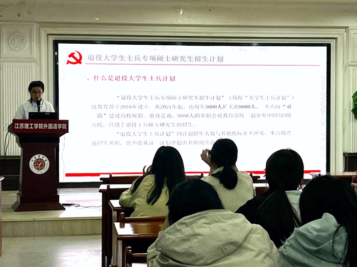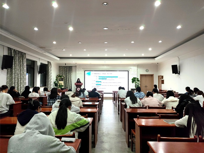 为了进一步加强学风建设,营造浓厚的学习氛围,明确考研奋斗目标,5月9日晚,外国语学院在50号楼503报告厅举办学风建设提升“朋辈同行计划”之考研经验分享会(英语专场)。本次分享会由21英语3S吴梦怡、21商英2施昕玥同学主讲,外国语学院考研协会指导老师、2023级辅导员卢天赉主持。