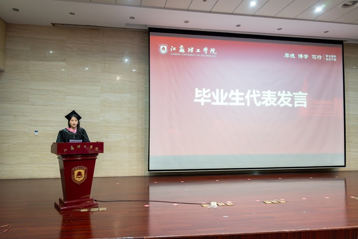 毕业生代表、21德语2班卞婷婷发言,她回顾了大学四年的成长历程,从初入校园的迷茫到如今的成熟自信,每一步都凝聚着师长的教诲与同窗的陪伴。她表示,毕业后将从事乡村振兴志愿者,扎根基层,立足外语专业优势,向世界讲述中国乡村故事,传递新时代中国声音,以实际行动践行青春誓言,把个人理想融入祖国发展大局,用奋斗擦亮青春底色。