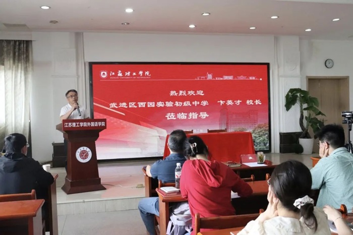 5月7日下午,外国语学院与武进区西园实验初级中学在503会议室举行教育实践基地签约暨英语、商务英语系教工党支部与武进区西园实验初级中学党支部共建签约仪式。武进区西园实验初级中学党支部书记兼校长卞英才、外国语学院党委书记王毅,院长张鑫,副院长兼英语、商务英语系教工党支部书记杨国萍,英语系主任罗贤卿,副系主任陆海空,以及22级英语师范生参加活动。王毅主持签约活动。