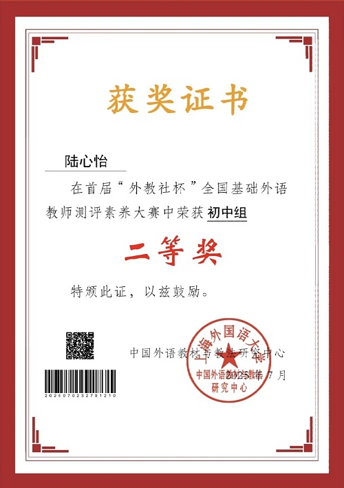 近日,由上海外国语大学中国外语教材与教法研究中心主办、上海外语教育出版社承办的首届“外教社杯”全国基础外语教师测评素养大赛圆满落幕。外国语学院英语系学子凭借充足的准备和出色的临场表现斩获佳绩,刘鑫栎、钱梦婷荣获初中组一等奖,陆心怡荣获初中组二等奖。