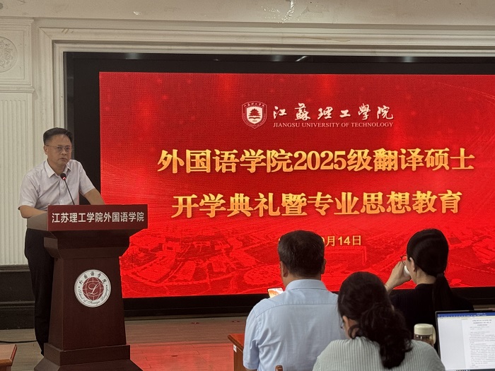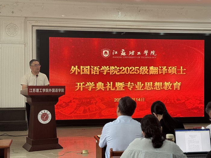 第一阶段为开学典礼。外国语学院院长张鑫首先致辞,热烈欢迎首批翻译硕士新生的到来。他介绍了学院简况,指出学院MTI培养目标为在人工智能时代背景下致力于培养具有深厚人文底蕴、扎实实践能力、开阔国际视野的高层次应用型翻译人才。研究生导师代表、外国语学院教授张德福发言,他分享了自己求学经历和感悟,期待研究生们主动践行“自信、努力、自律、感恩”的人生观和价值观。25研翻译1班刘路易作为新生代表发言,她表示以“厚德、博学、笃行”的校训作为自己研究生生涯的学习指南。