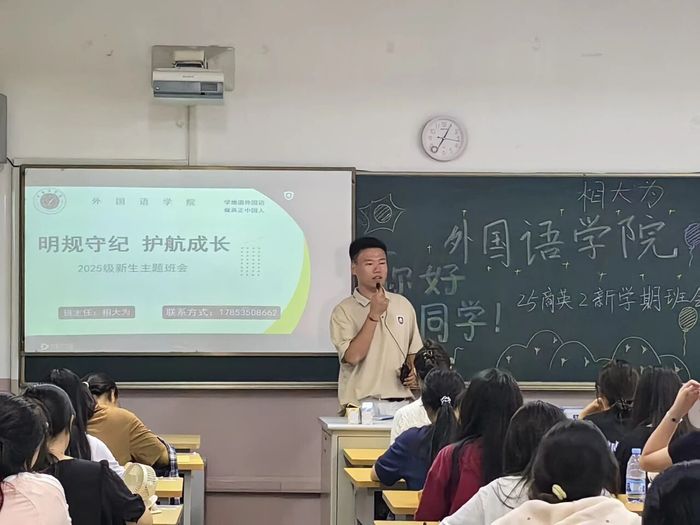 为助力2025级新生尽快适应大学环境、明确学习目标、树立纪律意识并培育集体认同感,9月13日晚,外国语学院各班级分别组织召开新生入学第一次主题班会。班会由各班班主任、导生主持,2025级全体新生按班级参与了班会课。
