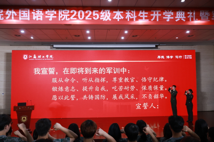 新生军训宣誓仪式中,在退伍大学生士兵、24英语3S班的颜炼和23商英1班的周梓钰的领誓下,全体新生举起右拳,用铿锵有力的誓言表达了不畏艰难、严格训练、遵守纪律的坚定决心。铮铮誓言,展现了新生们良好的精神风貌和不怕吃苦的决心。
