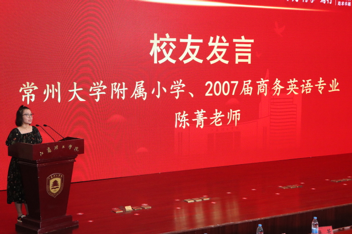 常州大学附属小学教师、2007届商务英语专业优秀校友陈菁为新生做分享发言。陈菁深情回忆了在外国语学院度过的美好时光,感恩母校的栽培。她结合自己职业成长历程,勉励学弟学妹们努力学习脚踏实地,积极参与社会实践活动,不断提升专业素养。