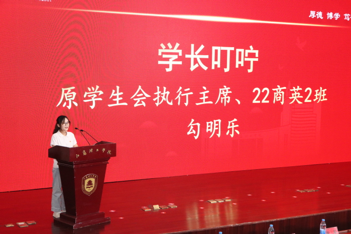 原学生会执行主席、22商英2班勾明乐作为老生代表发言。过来人的角度,分享了自己在校学习、实践和工作的经验与感悟,就如何适应大学节奏、合理规划时间、加入社团等方面给出了实质性的建议。