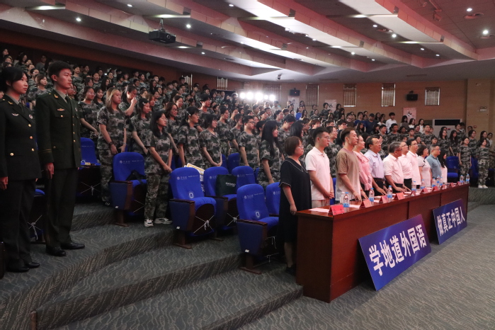 新生军训宣誓仪式中,在退伍大学生士兵24英语3S班的颜炼和23商英1班的周梓钰领誓下,全体新生举起右拳,用铿锵有力的誓言表达了不畏艰难、严格训练、遵守纪律的坚定决心。铮铮誓言,展现了新生良好的精神风貌和不怕吃苦的决心
